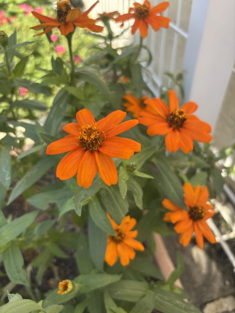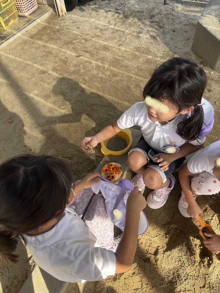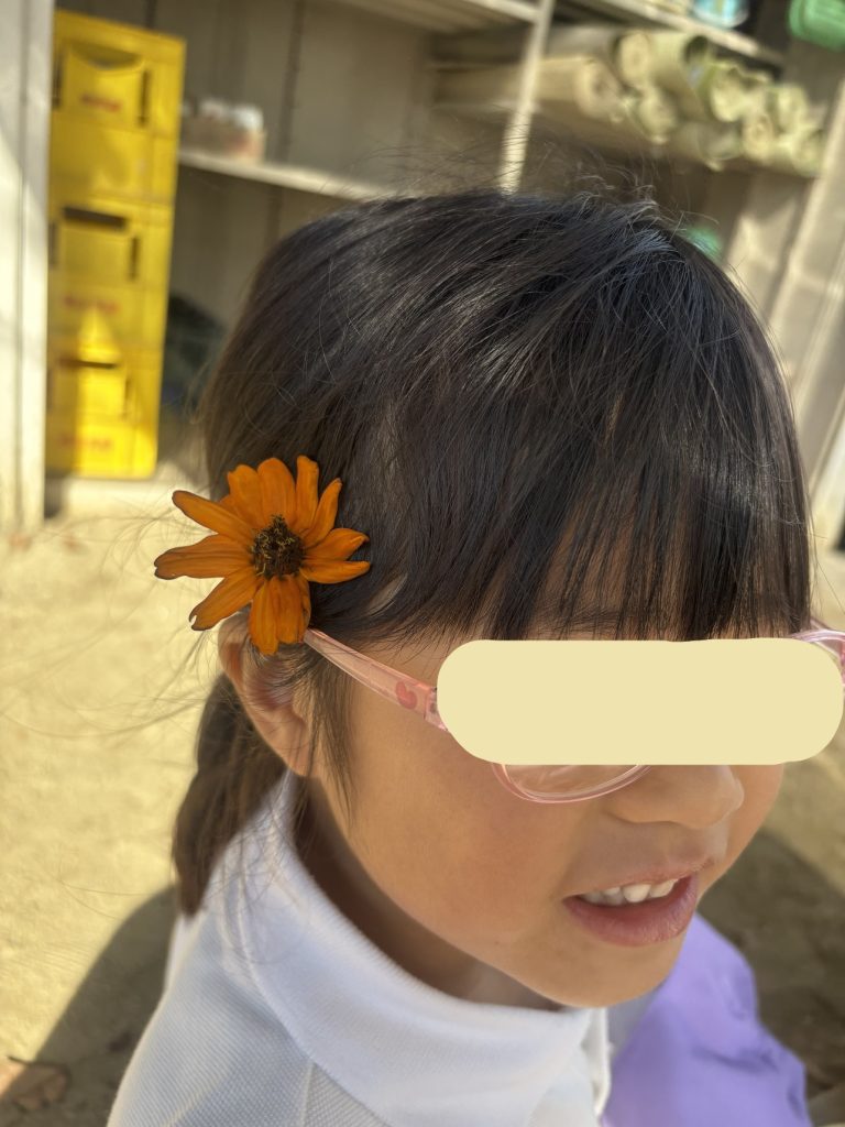 百日草を整えて、いくつか落ちた花を「おままごとに使う?」と渡すと、嬉しそうに女の子たちが持っていきました。