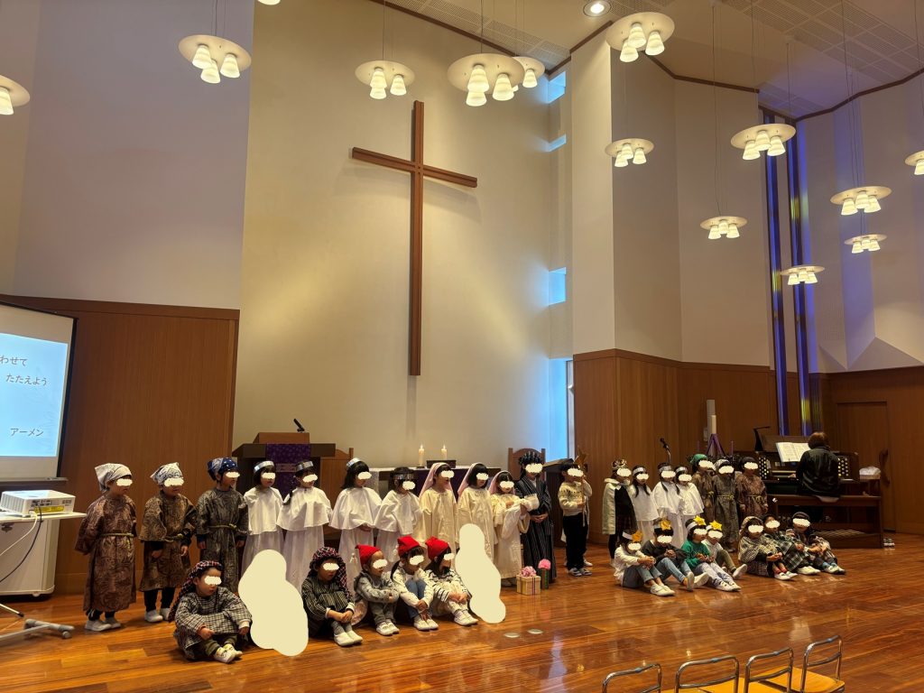 4歳児、5歳児さんは、クリスマス礼拝の中で降誕劇をするため、教会で大きな声で讃美歌を歌う練習に励んでいます。