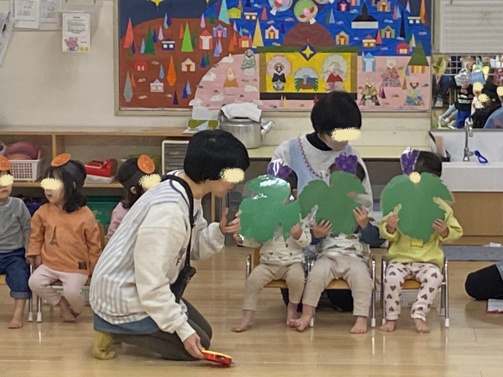 0、1、2、3歳児さんもクリスマス祝会で披露する劇あそびを当日の会場の雰囲気に慣れて、ニコニコ参加できるように行っていました。乳児さんは、泣いてても笑っていても怒っていてもハプニングが起きても、その場にいてくれるだけで、なんだかかわいいです