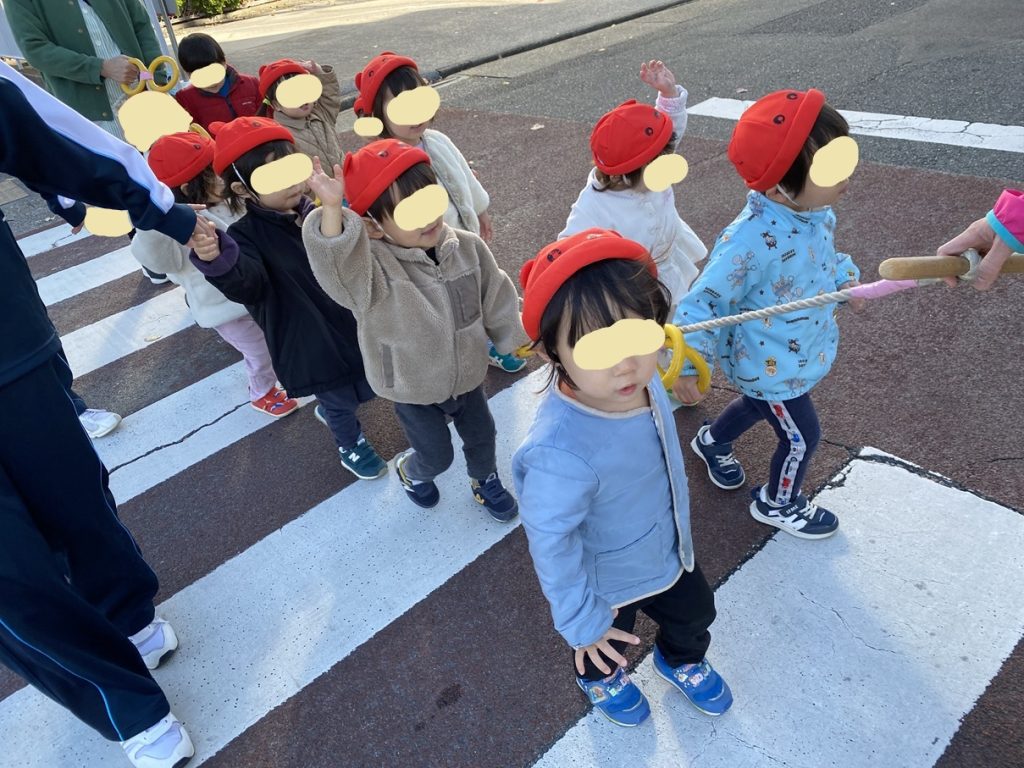 1歳児のもも組さんも、お散歩ロープを握って上手に歩いてお散歩ができるようになりました☆