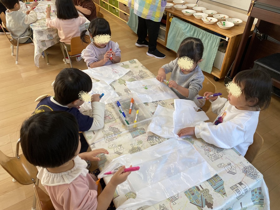 2歳児ばら組さん、1歳児もも組さんはお正月あそび「凧」を作っていましたよ!