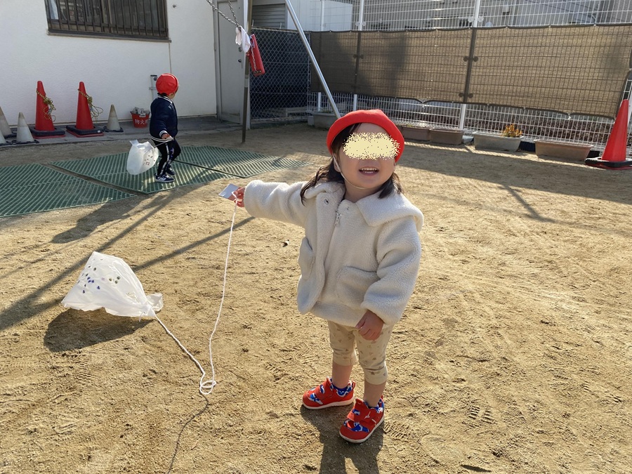 完成した凧を持って園庭へ。ぼく、わたしのたこ、かぜにのってとんでゆけ~(^o^)丿