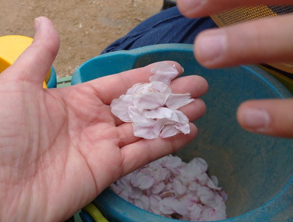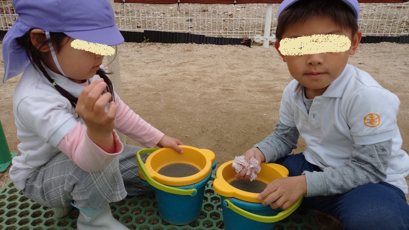 「なにやってるの?みせて~」風で桜の花びらが、たくさん飛んで来ていたんですね。「きれいだね~」と、たくさん集めていました!!
